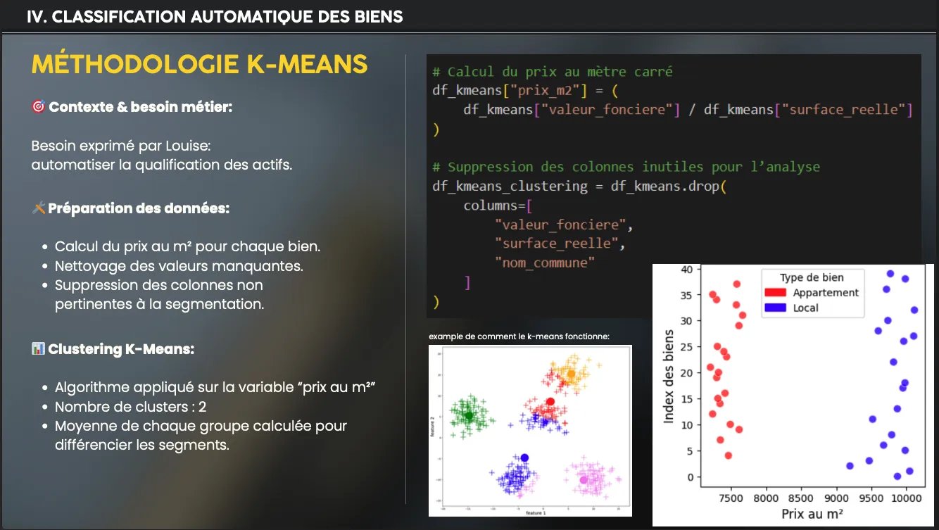 • Implement a K-Means clustering algorithm to automatically classify properties (apartments vs commercial spaces), addressing a request from Louise (director at “Les Plus Beaux Logis de Paris”).